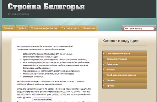 О компании: Компания “Стройка Белогорья” предлагает широкий ассортимент сеток металлических и пластиковых , проволоки, метизной продукции, перфорированного крепежа, пленки, электродов сварочных и многое другое. О проекте: