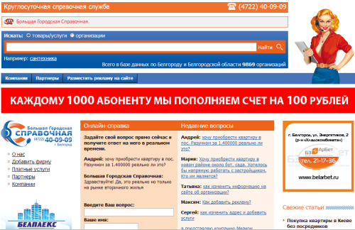 О компании: Справочная поисковая служба 40-09-09 – это уникальная база данных, в которой содержится только самая актуальная и достоверная информация о товарах, услугах, организациях и фирмах Белгорода.