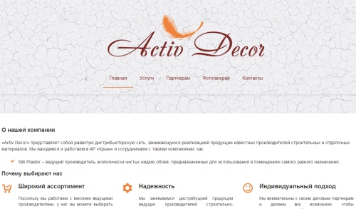 О компании: «Activ Decor» представляет собой развитую дистрибьюторскую сеть, занимающуюся реализацией продукции известных производителей строительных и отделочных материалов.