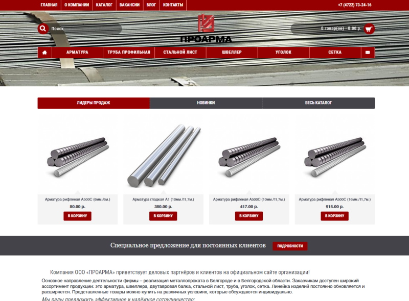 ООО «ПРОАРМА» - многопрофильная организация из Белгорода, также представленная в Белгородской области. Основное направление деятельности – поставка металлопрокатных изделий физическим и юридическим лицам. Компания располагает собственными складскими помещениями, штатом сотрудников для обслуживания заказчиков и транспортом для доставки.